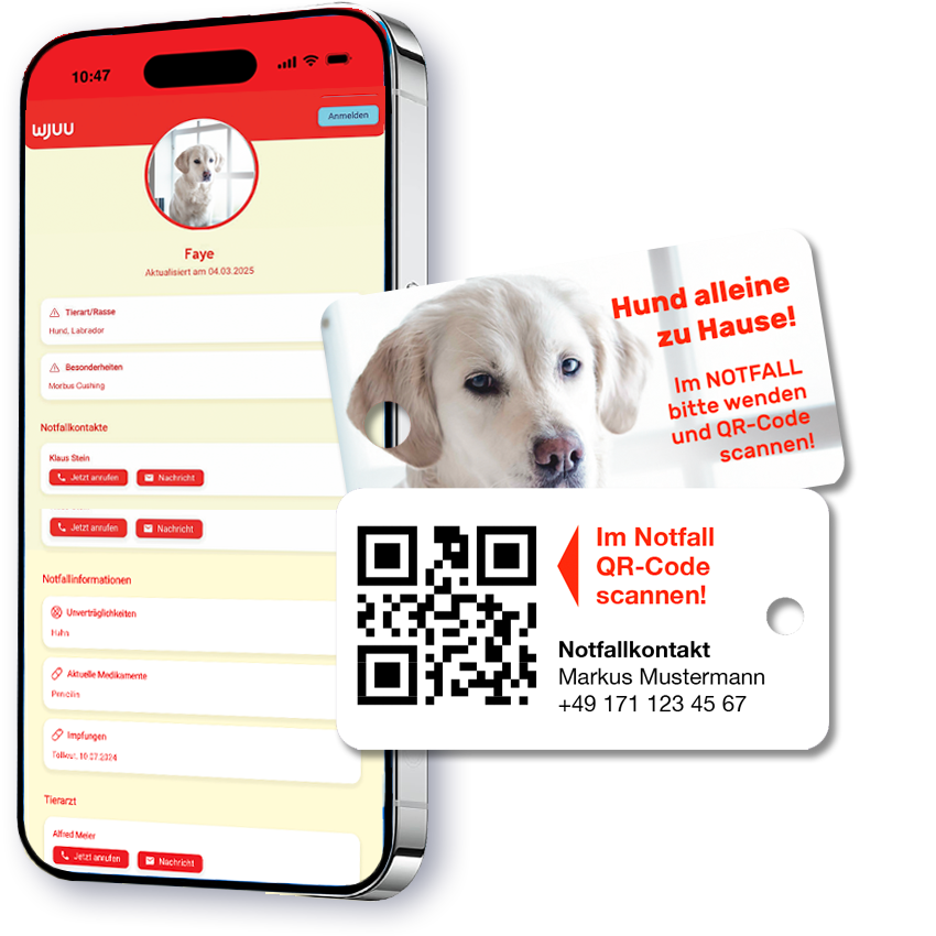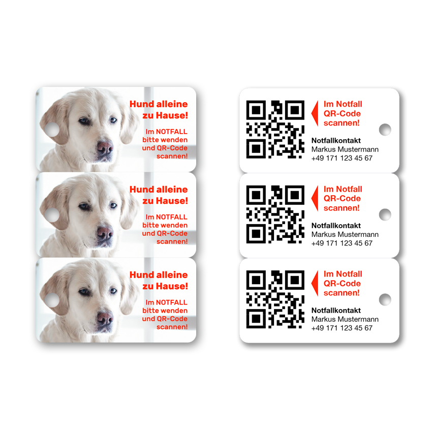Hinter dem aufgedruckten QR-Code verbirgt sich ein umfassendes Notfallprofil Ihres Haustieres. Nach einem einfachen Scan mit jedem Smartphone öffnet sich sofort eine Seite mit allen wichtigen Informationen: Ihr hinterlegter Notfallkontakt, detaillierte Gesundheitsdaten Ihres Tieres, spezielle Bedürfnisse wie Medikamente oder Allergien sowie wichtige Hinweise für den Betreuer. So können Sie sicher sein, dass im Fall der Fälle schnell und adäquat gehandelt werden kann.