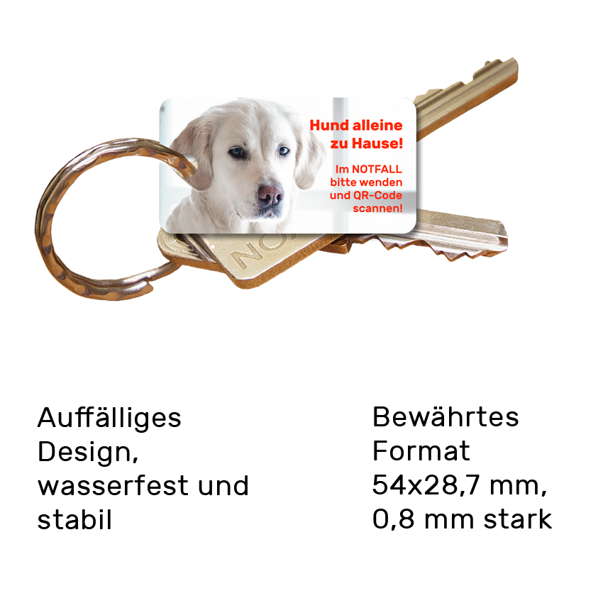 Dieser Notfall-Schlüsselanhänger für Hundebsitzer ist die ideale Ergänzung zur Notfallkarte. Während diese Karte primär für Situationen gedacht ist, in denen Ihnen geholgen werden soll, bietet der Schlüsselanhänger besonderen Schutz für Ihrem alleine zu Hause wartenden Hund. Er ist robust und ein unverzichtbarer Begleiter für jeden verantwortungsbewussten Tierhalter. Investieren Sie in die Sicherheit Ihres Lieblings – für ein beruhigendes Gefühl, jeden Tag.