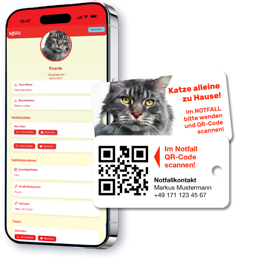 Unser innovativer Notfall-Schlüsselanhänger für Katzenbesitzer ist die perfekte Ergänzung für jeden verantwortungsbewussten Tierhalter. Er fungiert als digitale Notfallkarte für Haustiere alleine zu Hause und bietet im Ernstfall schnelle und unkomplizierte Hilfe für Ihr Tier. Befestigen Sie ihn einfach an Ihrem Schlüsselbund und haben Sie die wichtigsten Informationen immer griffbereit.